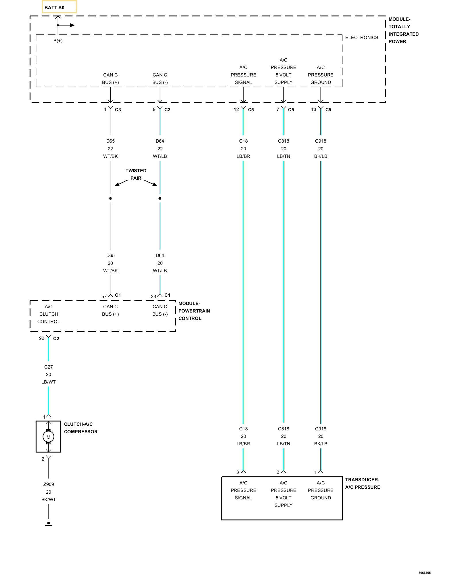 1. Using the wiring diagram/schematic as a guide, inspect the wiring and connectors between the A/C Pressure Transducer and the Totally Integrated Power Module (TIPM).