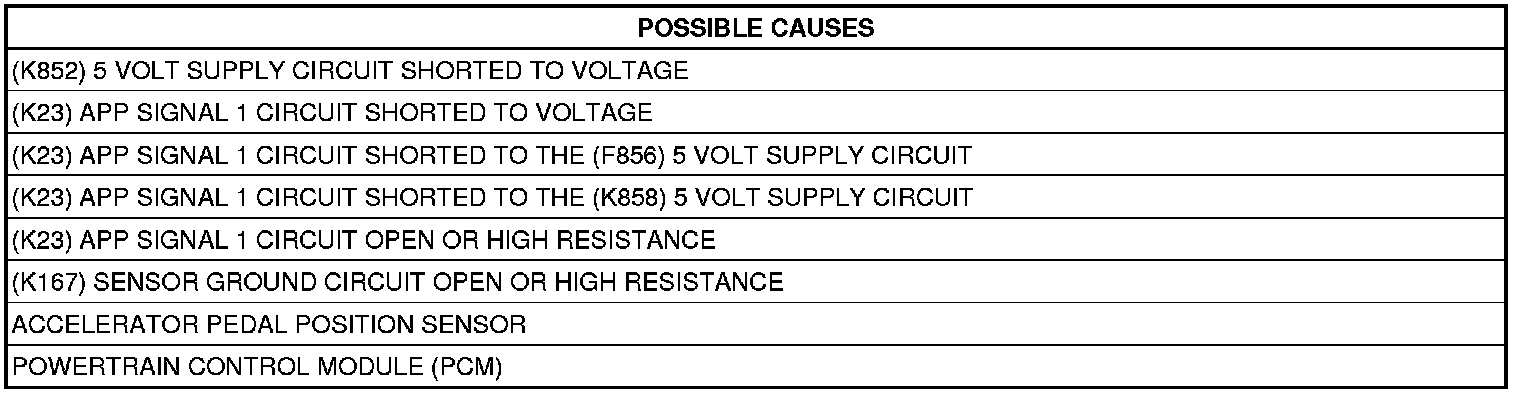 - Repair the (K23) APP Signal 1 circuit for a short to the (K852) 5-Volt Supply circuit.