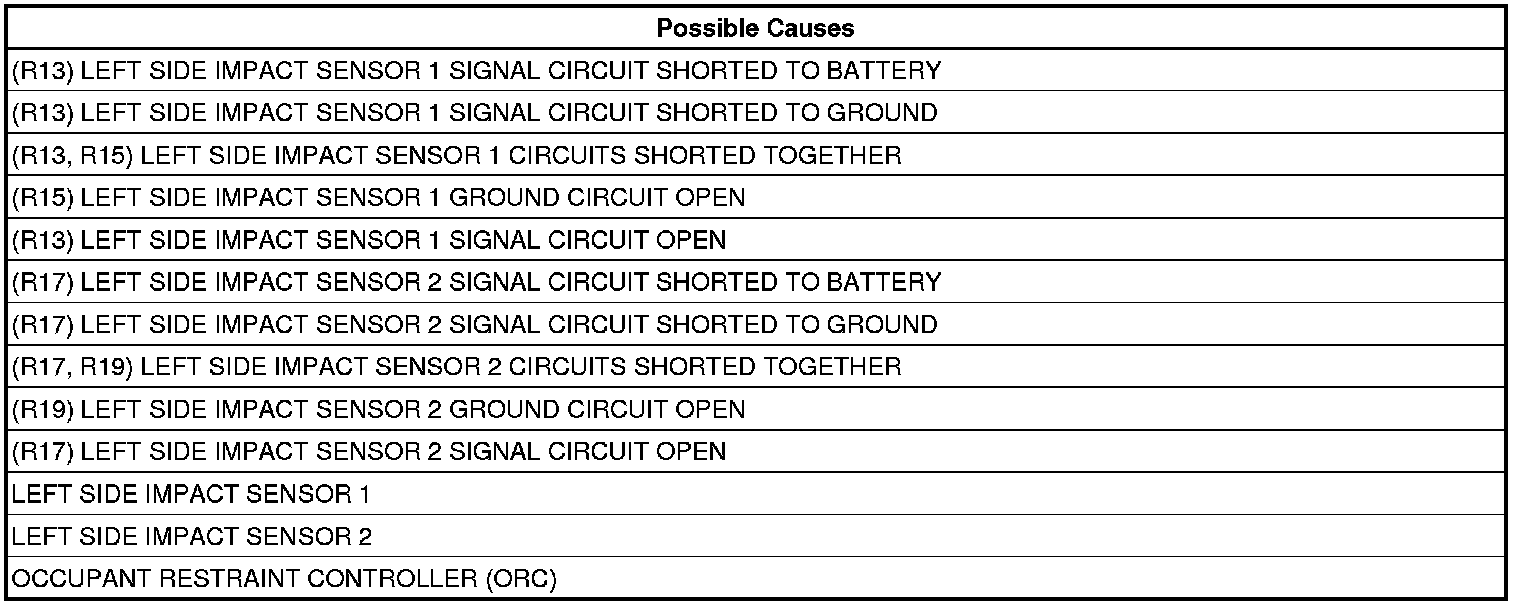 - Repair the (R13) Left Side Impact Sensor 1 Signal circuit for an open or high resistance.