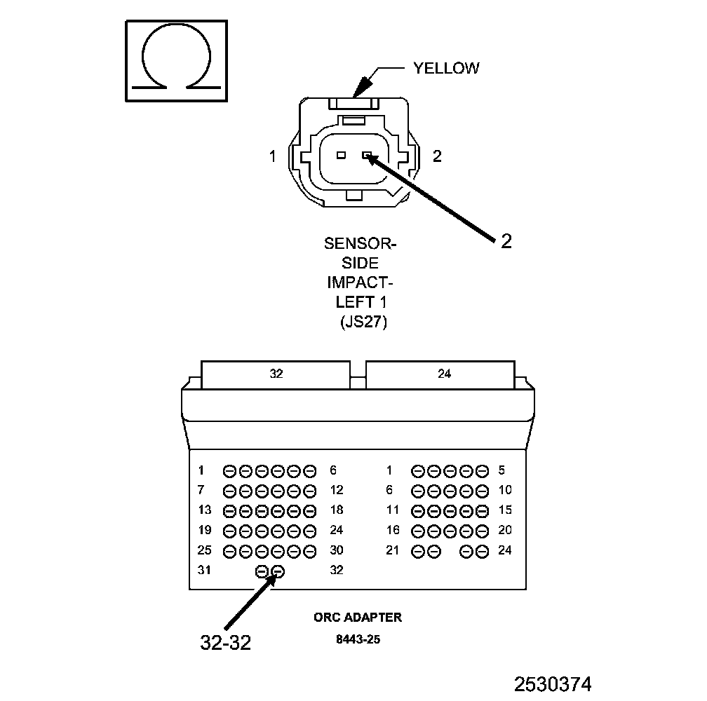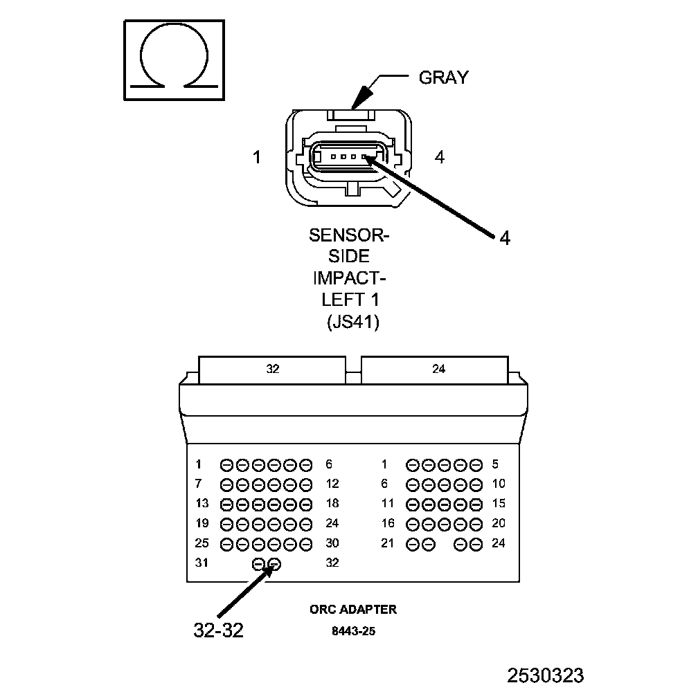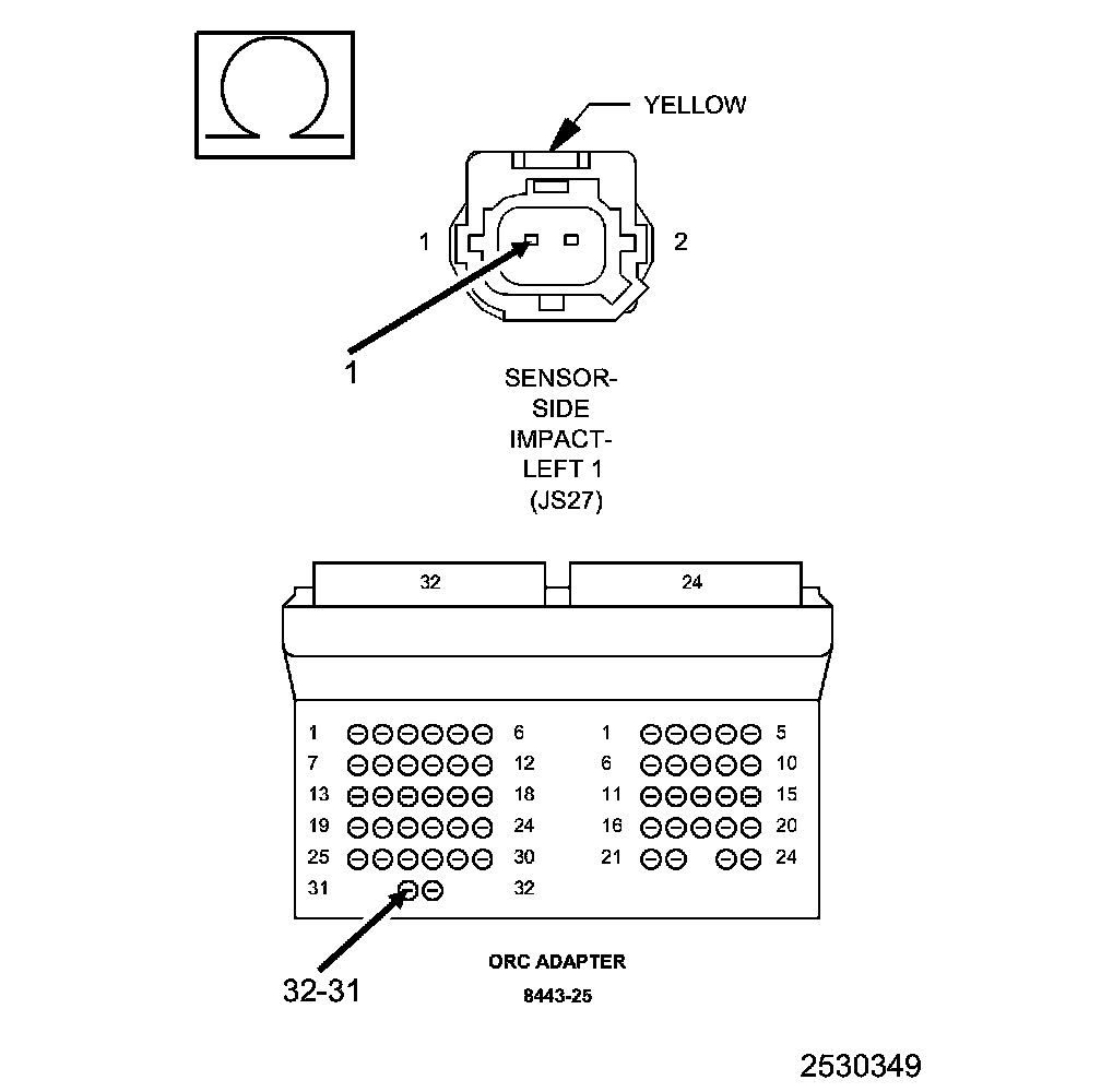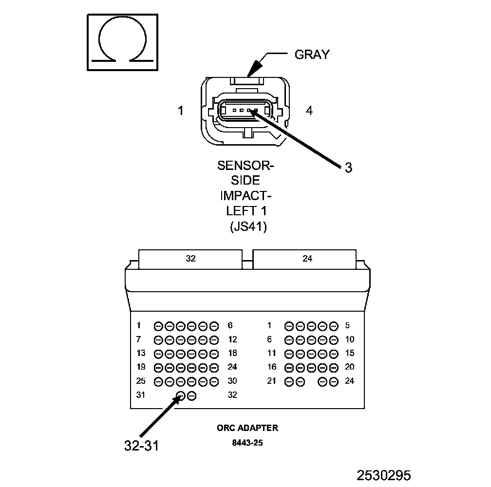 1. Measure the resistance of the (R17) Left Side Impact Sensor 2 Signal circuit between the Left Side Impact Sensor 2 harness connector and the SRS Load Tool Adaptor (8443-25).