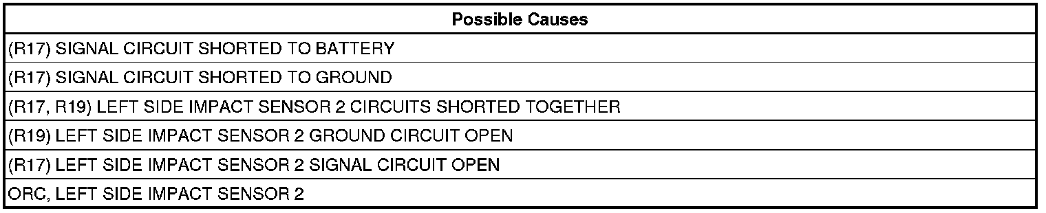 - Repair the (R17) Left Side Impact Sensor 2 Signal circuit for an open or high resistance.