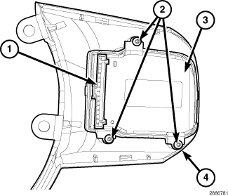 1. Position the Electronic Vehicle Information center (EVIC) switch pod (3) to the back of the steering wheel spoke front bezel (4).