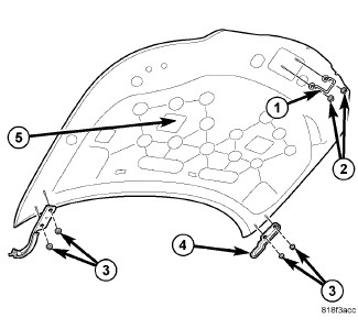 1. With assistance from a helper, place hood (5) in position on vehicle.