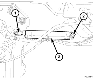 4. Install the hydraulic cylinder (3) on the pivot assembly and install the clips (1 and 2) at the ends of the cylinder.