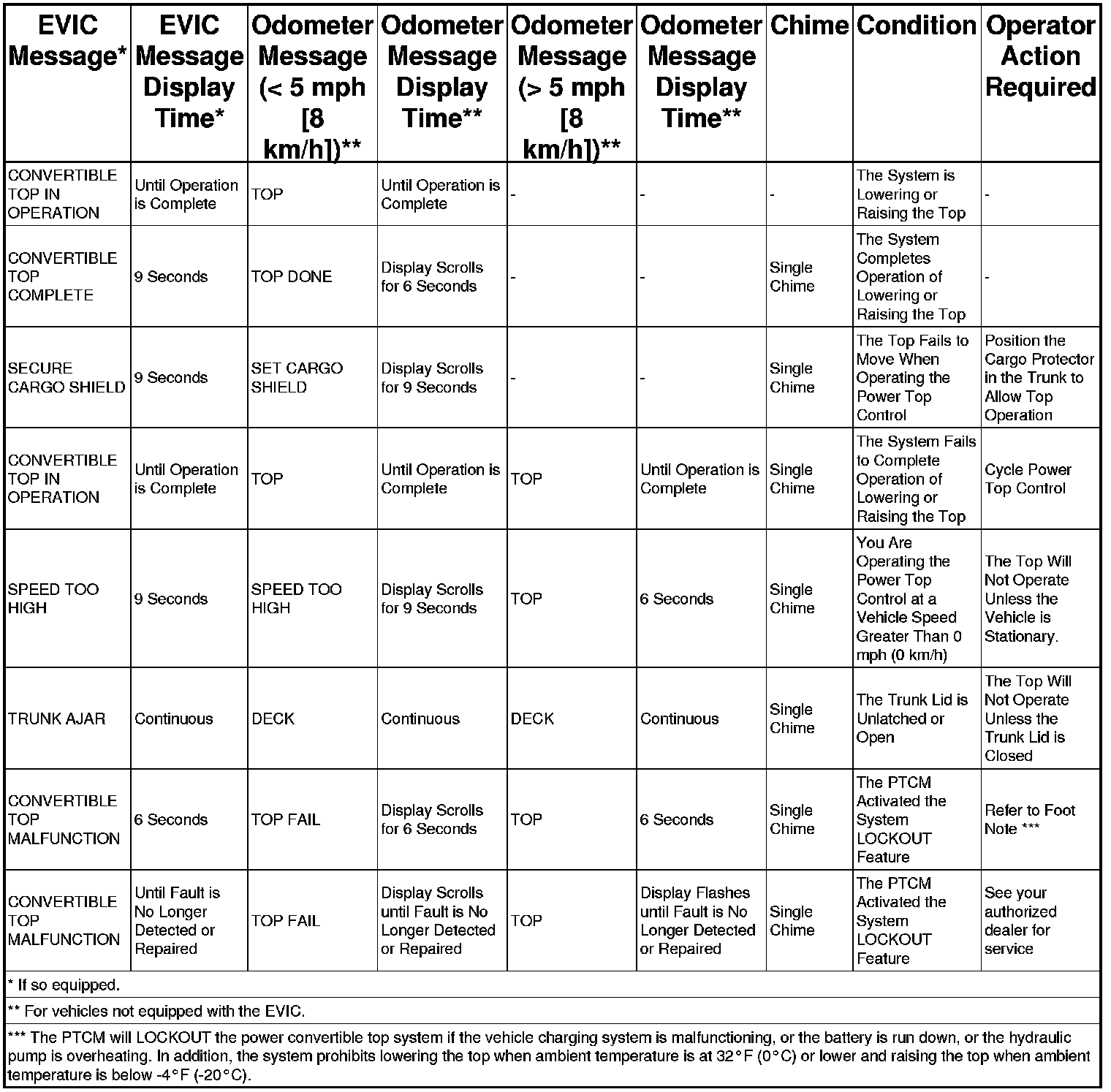 When the appropriate conditions exist, the Power Top Control Module (PTCM) displays various power folding top operation and warning messages in the Electronic Vehicle Information Center (EVIC) - if equipped, or in the Odometer for vehicles not equipped with the EVIC. Refer to the following chart for message related information: