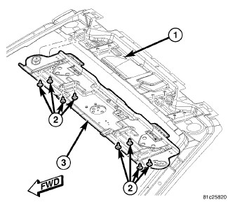 1. Position the folding top presenter plate assembly (3) onto the bottom side of the windshield header (1).