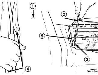 9. Install the box end of a 1/2 inch (13 mm) wrench (2) over the retainer for either the right (3) or left (5) parking brake cable. Push the wrench onto the retainer until the retainer fingers are collapsed. From under the carpeting, grasp the parking brake cable housing and pull the cable straight out of the bracket attached to the floor.
