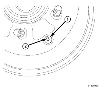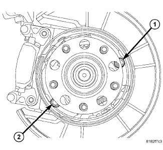 When adjusting the parking brake shoes with the drum-in hat rotor installed, rotating the adjuster wheel (2) upward will loosen the adjustment. Rotating the adjuster wheel (2) downward will tighten the adjustment.