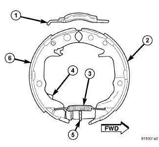 Left side shoes are shown in the figure. Right side shoes are a mirror image of the left except for the adjuster. The threaded portion of the adjuster should always be positioned to the left side in order to maintain consistent side-to-side rotational direction for adjustment purposes.