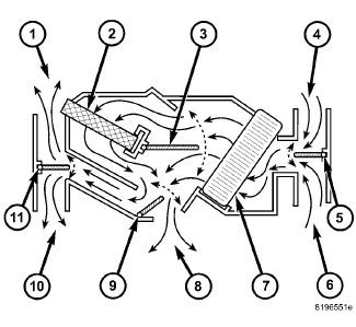 The heating-A/C system pulls outside (ambient) air through the fresh air intake (4) located at the cowl panel at the base of the windshield and into the air inlet housing above the heating, ventilation and air conditioning (HVAC) housing and passes through the A/C evaporator (7). Air flow is then directed either through or around the heater core (2). This is done by adjusting the position of the blend-air door (3) with the temperature control located on the A/C-heater control in the instrument panel. Air flow is then directed out the floor outlet (8), instrument panel outlet (10) or the defroster outlet (1) in various combinations by adjusting the position of the mode-air doors (9 and 11) using the mode control located on the A/C-heater control. The temperature and mode control uses electrical actuators to operated the air doors.
