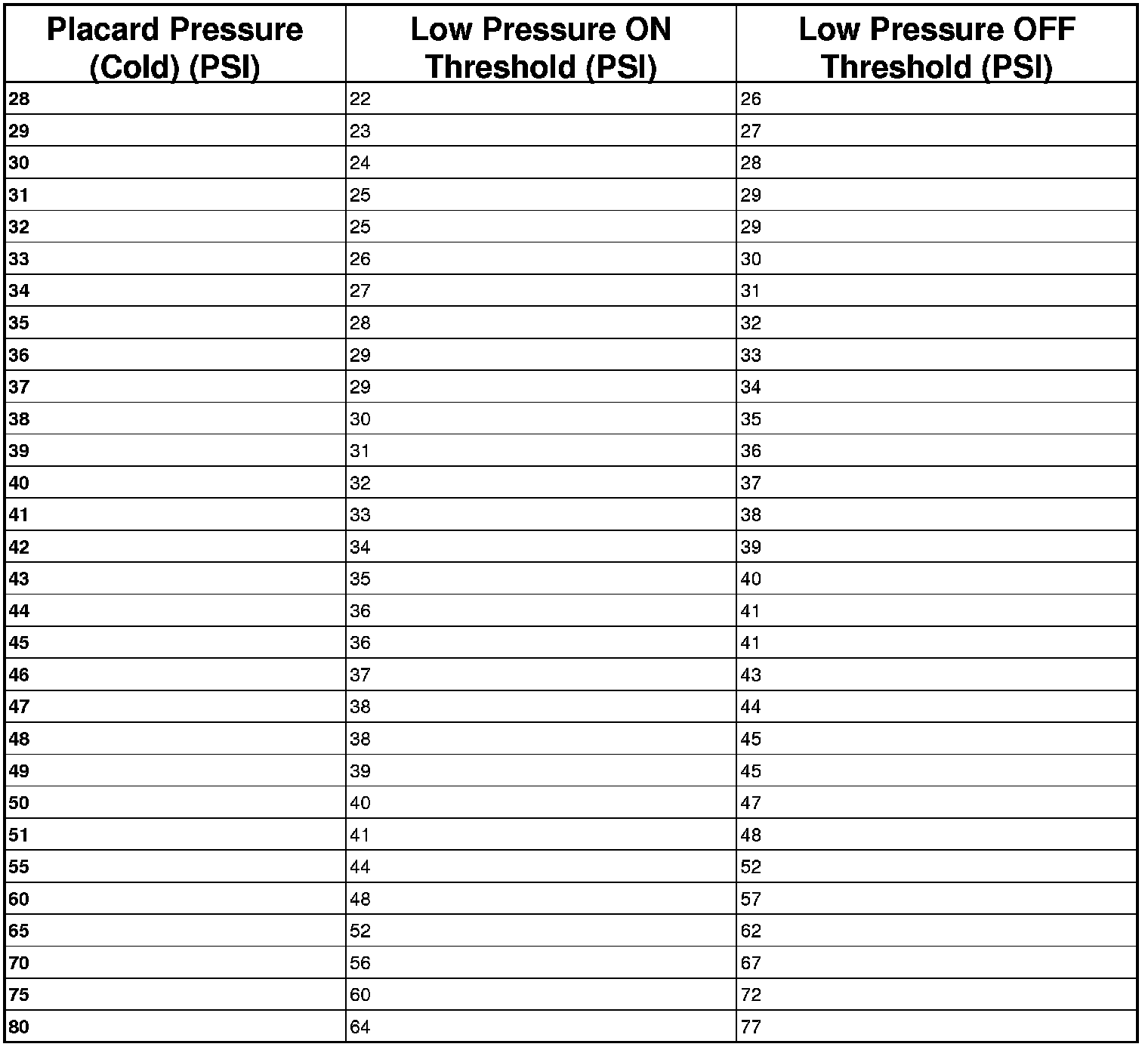 For both the premium and base TPM, the recommended "Placard Pressure", "Low-pressure Threshold" and "Hysteresis Pressure Values" for the tires installed on the vehicle, are stored in the WCM non-volatile memory during the initial Manufacturing Plant Process, or during a service procedure, as required. To determine the pressure thresholds for a vehicle, refer to the Tire Inflation Pressure (Placard) Label, and then apply the placard pressure to the following table. The Low Pressure OFF Threshold is defined as the Low Pressure ON Threshold plus the Hysteresis Pressure Value.