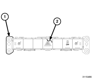 The hazard switch (2) is integral to the instrument panel switch pod (1) (also known as the Accessory Switch Bank Module/ASBM) just below the radio and above the heater and air conditioner controls in the instrument panel center stack. A red, stencil-like International Control and Display Symbol icon for Hazard Warning identifies the hazard switch button. The remainder of the hazard switch circuitry is concealed within the instrument panel switch pod.