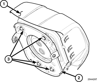 3. Remove the four E-clip retainers (3) that secure the airbag mounting bracket (2) to the airbag.
