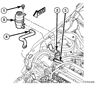 3. Place the fluid reservoir end of the supply hose (4) onto the reservoir (5) supply fitting. Expand the hose clamp and slide it over the hose and fitting. Secure the clamp once it is past the bead formed into the fluid reservoir fitting.