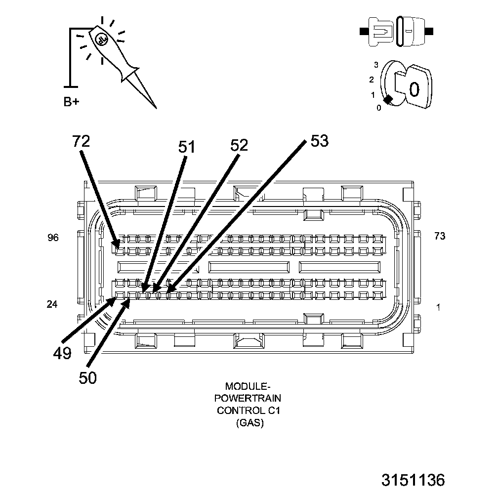 3. Using a 12-Volt test light connected to ground, probe the (A209) Fused B+ circuit in the PCM C1 harness connector.