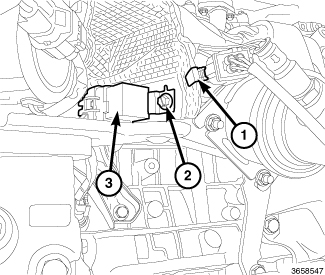 16. Remove the lower heatshield bolt (2) and reposition the air pump relay (3).