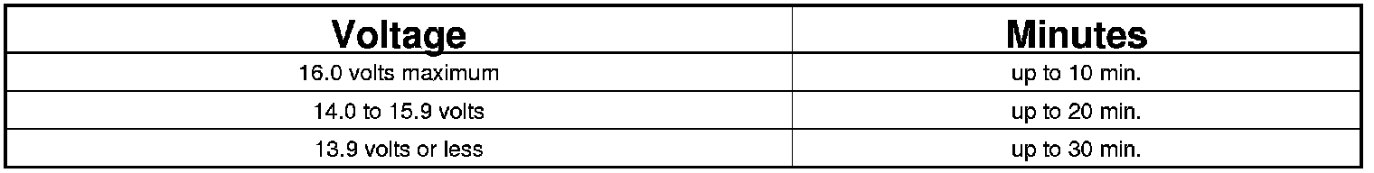 3. Battery chargers vary in the amount of voltage and current they provide. The amount of time required for a battery to accept measurable charging current at various voltages is shown in the Charge Rate Table. If the charging current is still not measurable at the end of the charging time, the battery is faulty and must be replaced. If the charging current is measurable during the charging time, the battery may be good and the charging should be completed in the normal manner.