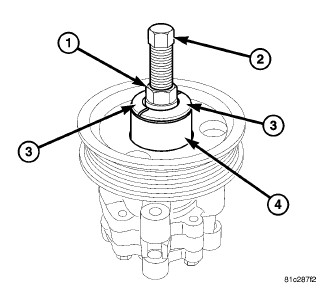 Do not hammer on power steering pump pulley or shaft to remove power steering pump pulley. Damage to pulley and power steering pump will occur.