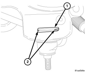11. Through the access hole (1) in the knuckle, tap the ends of the snap-ring (2) with a drift punch and remove it from the ball joint.