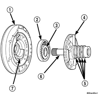 The oil pump is located in the pump housing inside the bell housing of the transmission case. The oil pump assembly consists of an inner (3) and outer (2) gear, a housing (1), and a cover that also serves as the reaction shaft support (6).