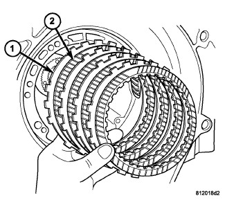 42. Install low/reverse clutch pack (1,2). Leave uppermost disc out until snap ring is installed.