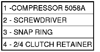 30. Setup Compressor (5058A) (1). compress 2/4 clutch return spring (4) (just enough to remove snap ring) and remove snap ring (3).
