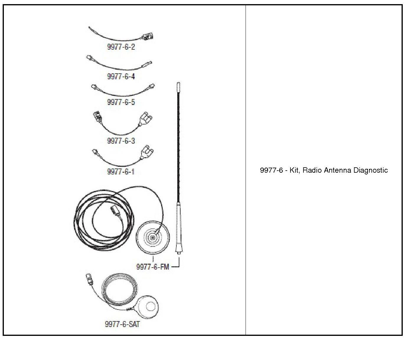 NOTE: While using the 9977-6-GPS test antenna the Satellite radio reception will not be available and Satellite radio faults may occur. The 9977-6 -GPS test tool will only enable GPS reception to work. For Satellite Radio reception concerns use test antenna 9977-6-SAT.