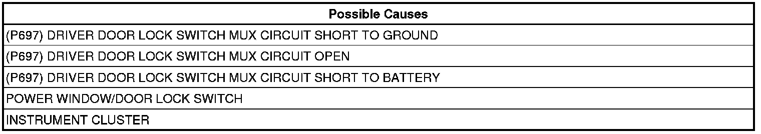 - Repair the (P697) Driver Door Lock Switch Mux circuit for a short to ground.