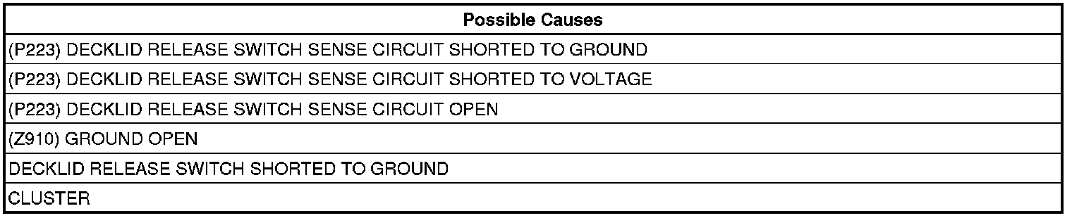 - Repair the (P223) Decklid Release Switch Sense circuit for a short to ground.