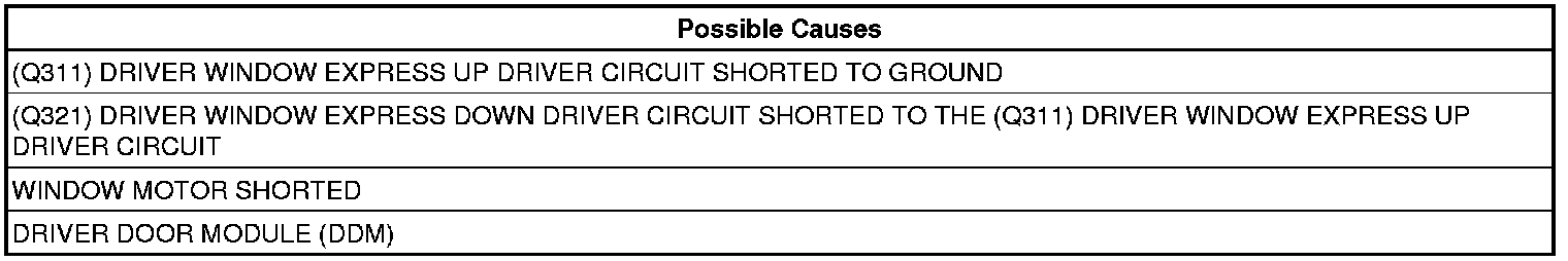- Repair the (Q311) Driver Window Express Up Driver circuit for a short to ground.