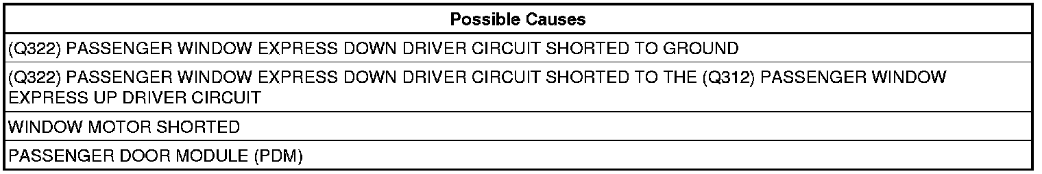 4. (Q322) PASSENGER WINDOW EXPRESS DOWN DRIVER CIRCUIT SHORTED TO THE (Q312) PASSENGER WINDOW EXPRESS UP DRIVER CIRCUIT