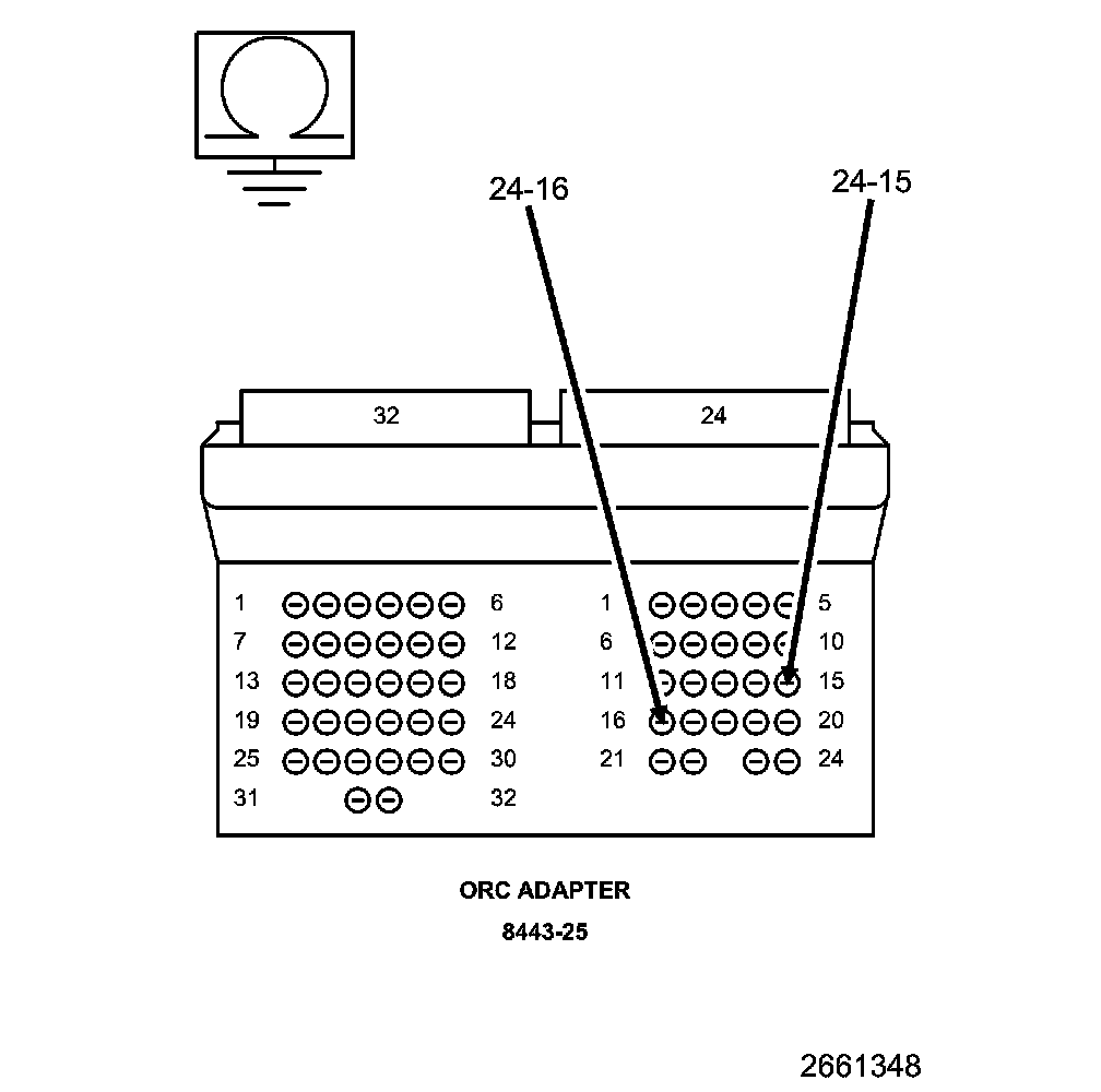 5. Measure the resistance of the (R44) Passenger Squib 1 Line 1 circuit between the SRS Load Tool Adaptor (8443-25) cavity 24-15 and ground.