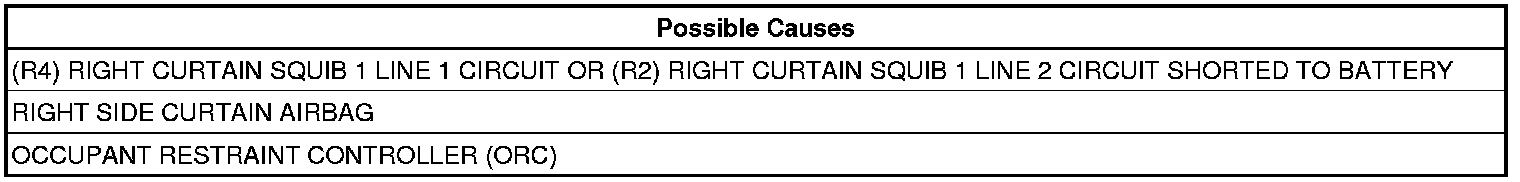 The Occupant Restraint Controller (ORC) monitors the voltage on the Right Curtain Squib 1 circuits. The ORC will set this DTC if it detects voltage on the Right Curtain Squib 1 circuits.