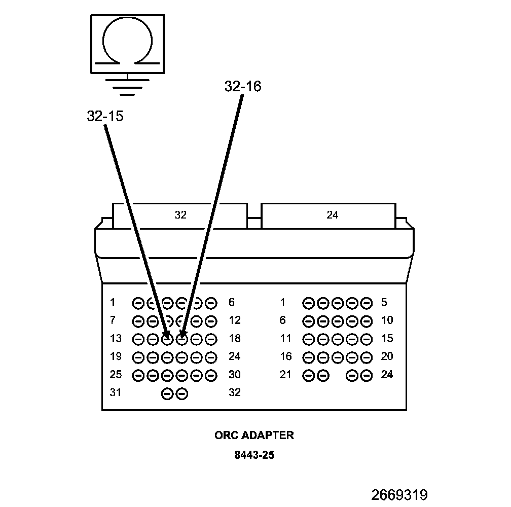 5. Measure the resistance of the (R53) Driver Seat Belt Tensioner Line 2 circuit between ground and the SRS Load Tool Adapter (8443-25) cavity 32-15.