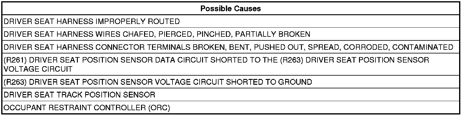 6. CHECK (R261) DRIVER SEAT POSITION SENSOR DATA CIRCUIT FOR A SHORT TO THE (R263) DRIVER SEAT POSITION SENSOR VOLTAGE CIRCUIT