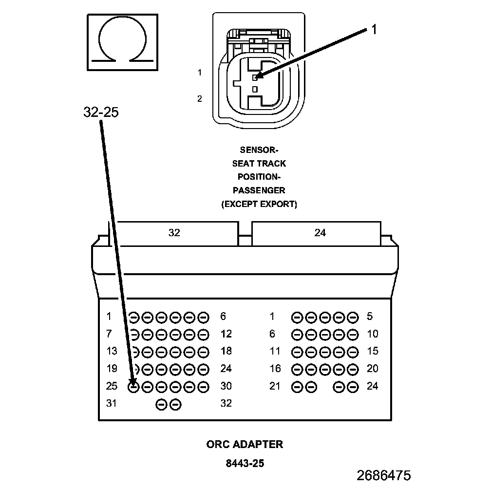 3. Measure the resistance of the (R262) Passenger Seat Position Sensor Data circuit between the (8443-25) cavity 32-25 and the Passenger Seat Track Position Sensor connector cavity 1.