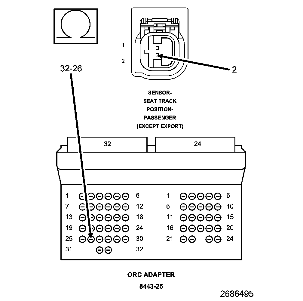 4. Measure the resistance of the (R264) Passenger Seat Position Sensor Voltage circuit between the (8443-25) cavity 32-26 and the Passenger Seat Track Position Sensor connector cavity 2.