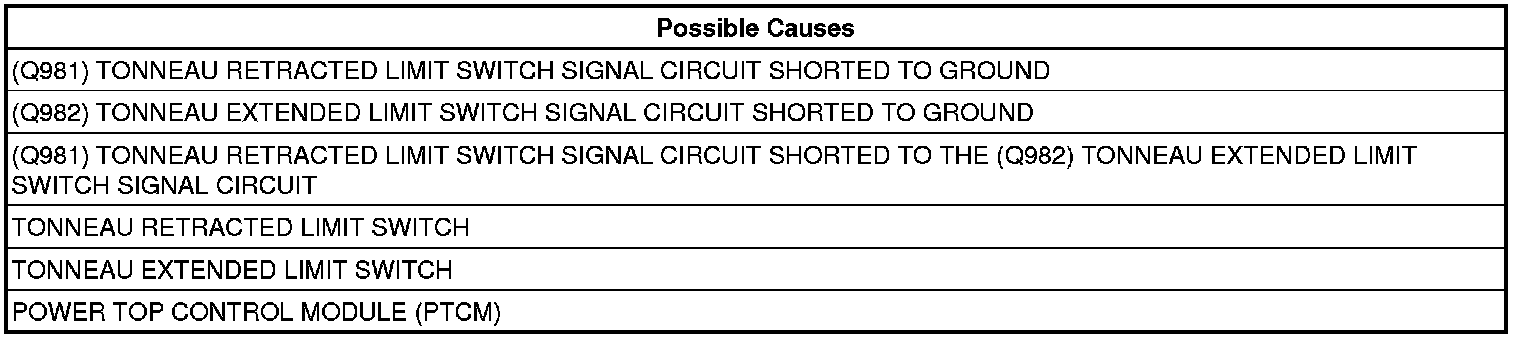 - Repair the (Q982) Tonneau Extended Limit Switch Signal circuit for a short to ground.