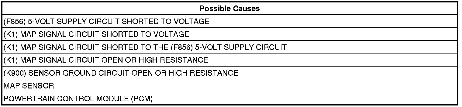 - Repair the (K1) MAP Signal circuit for a short to the (F856) 5-Volt Supply circuit.
