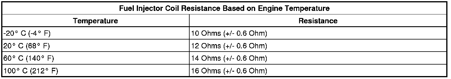 NOTE: The resistance of the circuit will vary according to the temperature of the injector coil. Use the table below to determine the resistance range of the injector.
