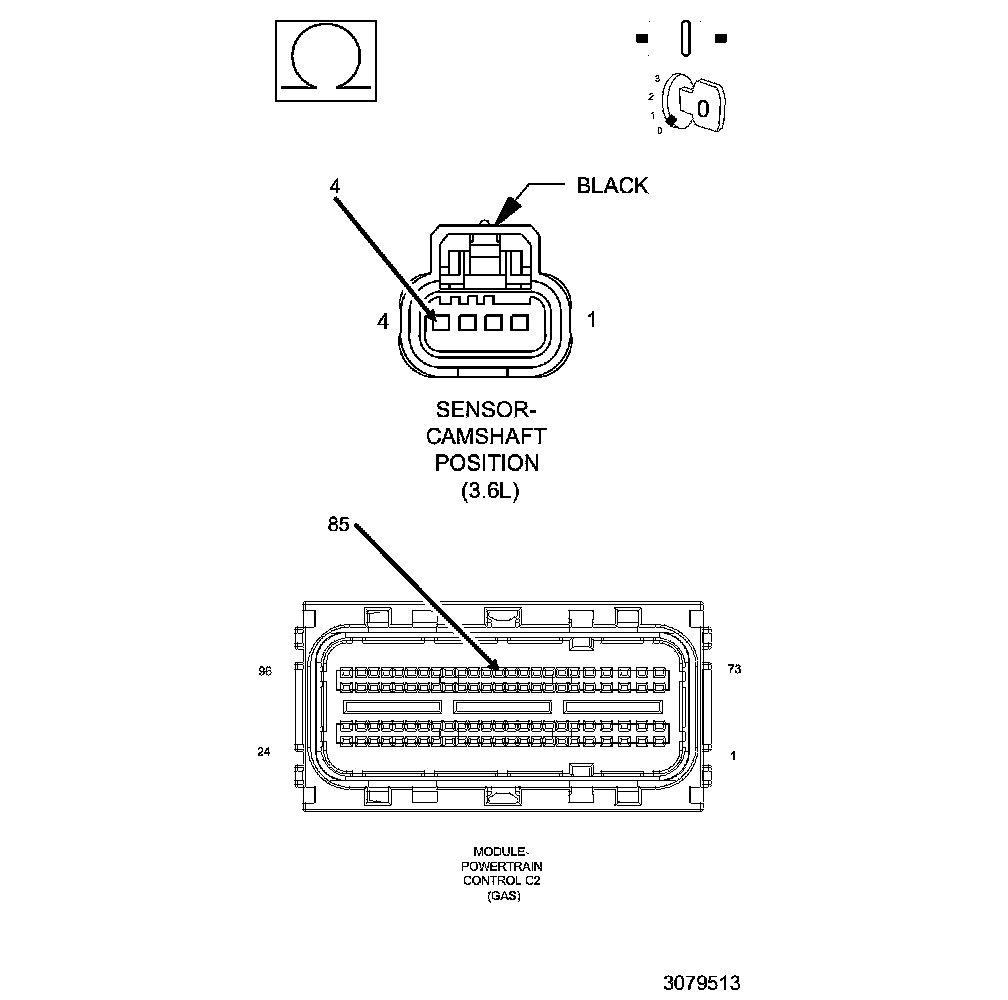 The 3.6L has four separate Camshafts that the Powertrain Control Module (PCM) requires positional information from. There are two Camshaft Position (CMP) Sensors on the 3.6L, with each CMP Sensor consisting of four circuits. The sensors are located at the top rear of each valve cover. On the end of each Camshaft is a magnetic encoder that is programmed with a magnetic pattern. The PCM provides a 5-Volt supply and a sensor ground circuit to the CMP Sensor and the CMP Sensor provides two Camshaft positional signals, the intake and exhaust camshaft position, to the PCM. The sensor detects the magnetically encoded information, a series of magnetic peaks and valleys, from the encoder. As each Camshaft rotates, the magnetic encoded pattern passes by the CMP Sensor creating a changing magnetic field at the sensor face. The changing magnetic field is interpreted by the sensor electronics and a digital output, ON/OFF or HIGH/LOW pattern, is produced. The length of the pulse width generated by the CMP varies in size based on the velocity of the Camshaft. The PCM decodes the digital pattern to identify the Camshaft position. The information from each individual Camshaft along with the Crankshaft information is used to control and sequence the Variable Valve Timing (VVT) system and fuel injection events.