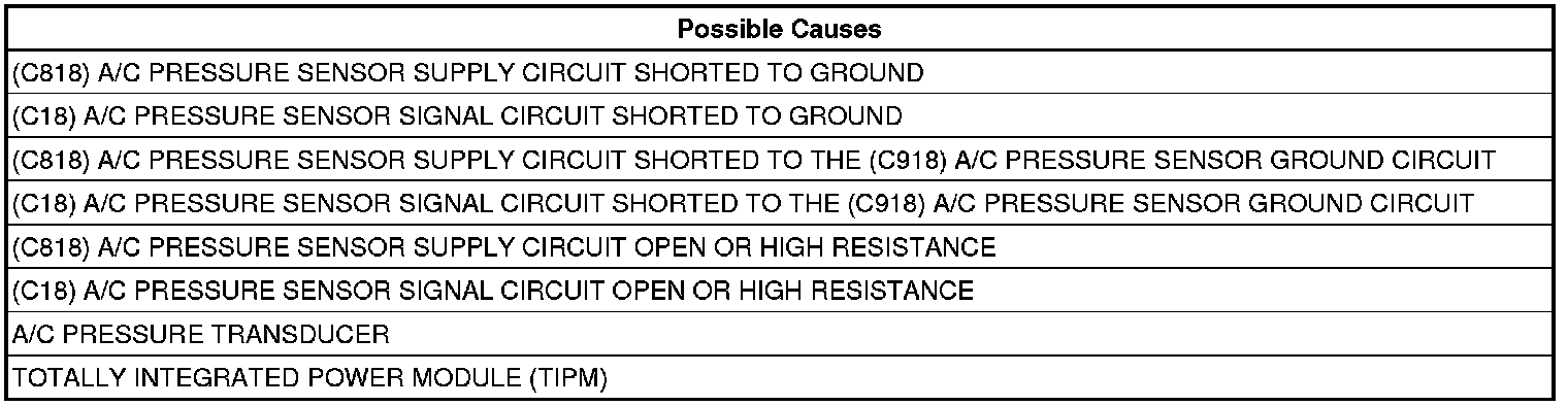 - Repair the (C818) A/C Pressure Sensor Supply circuit for a short to ground.