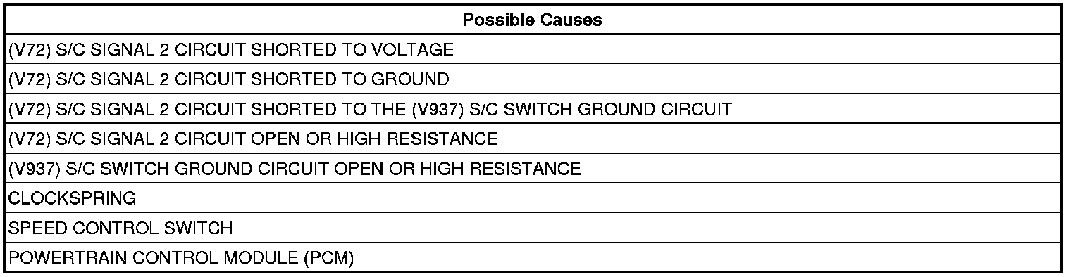 3. Measure the resistance between the (V72) S/C Signal 2 terminal and the (V937) S/C Switch Return terminal at the Speed Control Switch, not the harness connector.