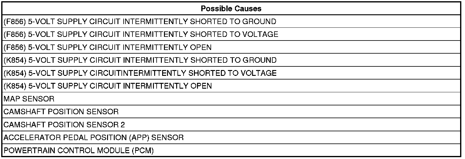 When the Powertrain Control Module (PCM) recognizes the (F856) 5-Volt Supply circuit voltage is varying too much to quickly. One Trip Fault. ETC light is flashing.