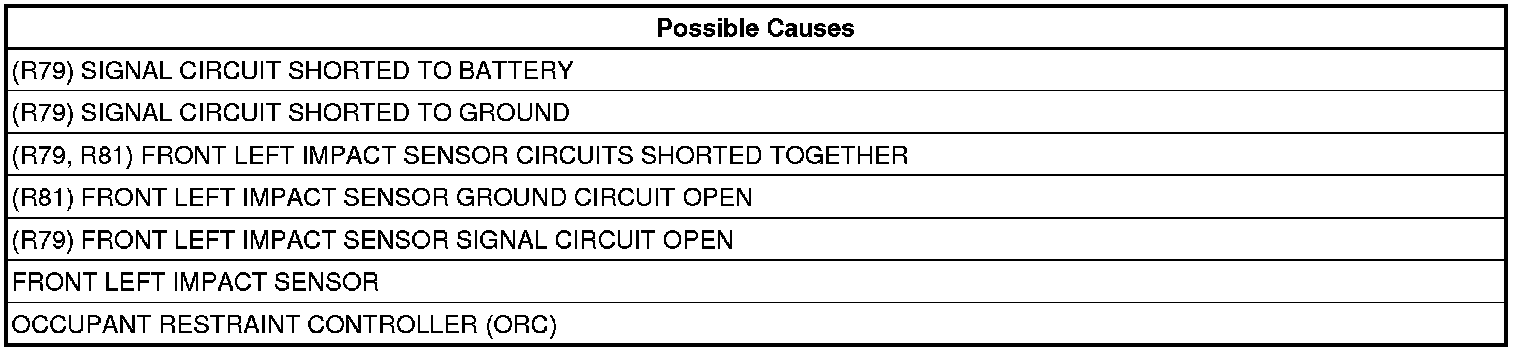 - Repair the (R79) and (R81) Front Left Impact Sensor circuits for a short to battery.