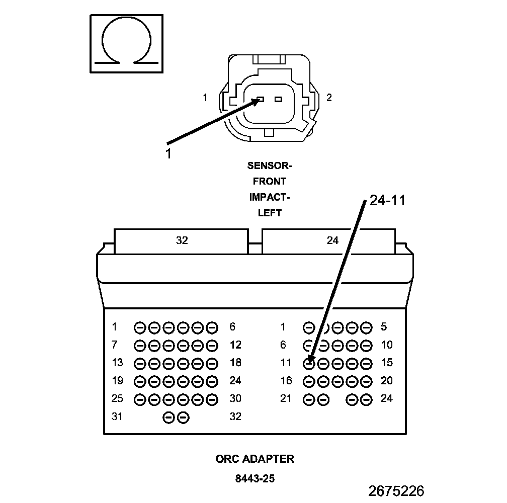 1. Measure the resistance of the (R79) Front Left Impact Sensor Signal circuit between the Front Left Impact Sensor harness connector and the SRS Load Tool Adaptor (8443-25).