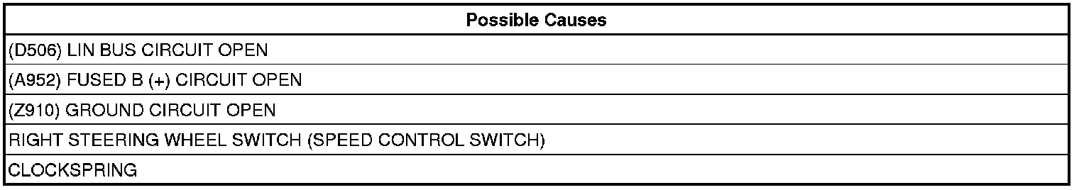 3. (D506) LIN BUS CIRCUIT OPEN BETWEEN THE RIGHT STEERING WHEEL SWITCH (SPEED CONTROL SWITCH) AND CLOCKSPRING