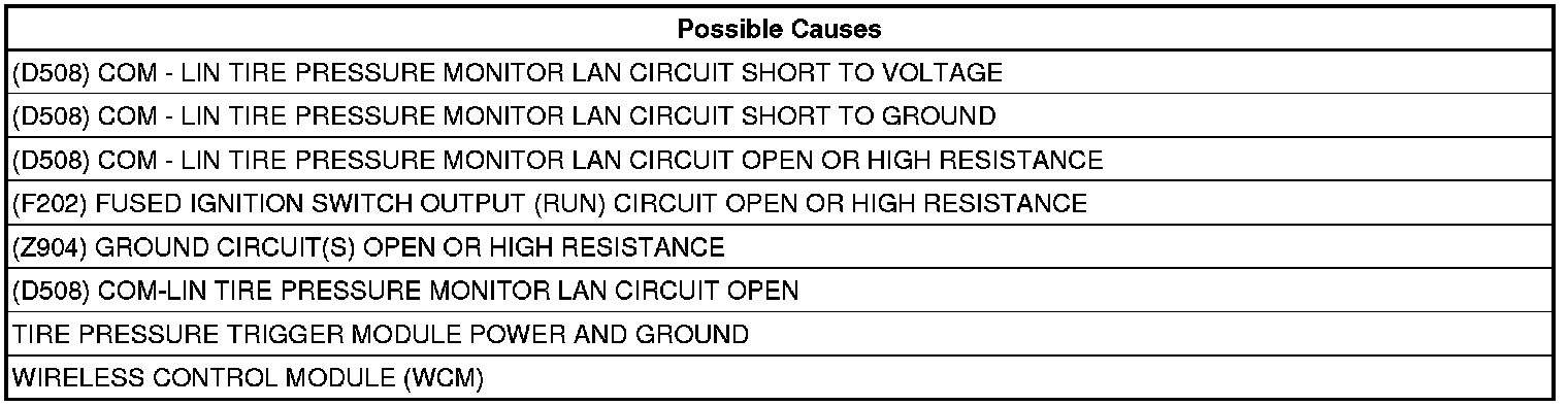 - Repair the (D508) COM - LIN Tire Pressure Monitor LAN circuit for a short to ground.