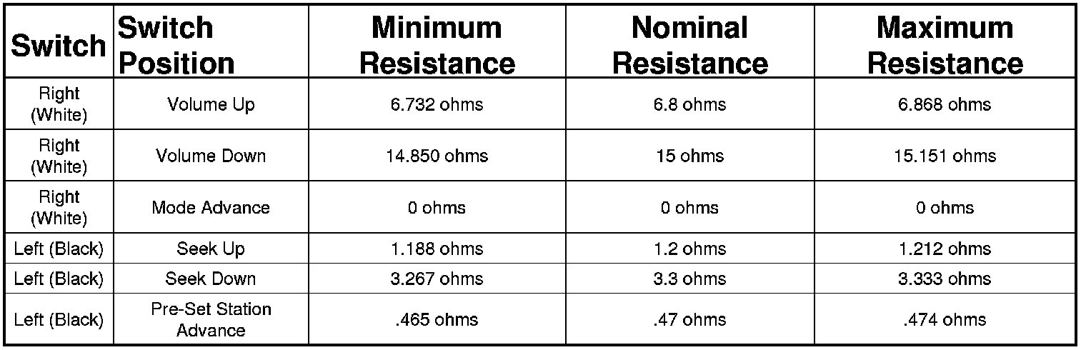 2. Use an ohmmeter to check the switch resistances as shown in the Remote Radio Switch Test table. If the remote radio switch resistances check OK, go to step 3. If not OK, replace the faulty switch.