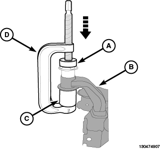 2. Tighten Press, (D) screw-drive, pressing isolator into crossmember (B). Install isolator until isolator can flange contacts surface of crossmember.